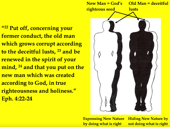 On the other hand, a Christian who is yielding to his or her sinful flesh (“deceitful lusts”) is hiding his or her new righteous and holy nature inside them. This type of believer is represented by the image on the right. He or she is concealing his or her righteous and holy born-again nature by not living righteously. Failure to manifest their new nature through their actions does not jeopardize their salvation, but it does disrupt their fellowship with God and other believers (I John 1:3-10; 2:9-11; et al.) and forfeit eternal rewards in the future (I Cor. 3:8-15).