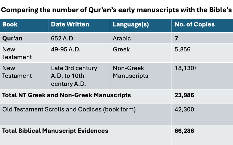 When we compare the historical documentary evidence of the Qur’an and the Bible (see above chart), we discover when the earliest biographies and sayings for both faiths were written. For Christianity, they were written 16-57 years after Jesus’ death on the cross by those from the same area. But for Islam, they were written 400-900 years later, and by those who were hundreds of miles too far north. Which do you think has more authority and reliability?