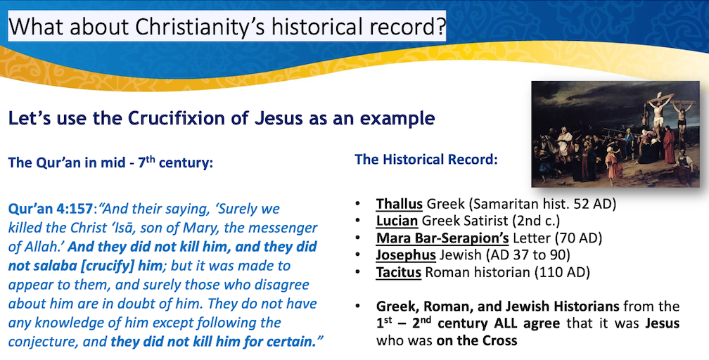 Who are we going to believe? The Qur’an, which Islam claims was written in the mid-7th century, over 600 years after Jesus walked on the earth, or these 1st and 2nd century Greek, Roman, and Jewish writers who lived much closer to the time of Jesus? We can see from this one example that Christianity has a much better historical record than does Islam.