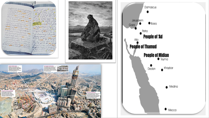 Linguists have observed that theArabic word endings used in the Qur’an do not come from Mecca, but from Nabataean Aramaic, which is situated 600 miles farther north around the city of Petra (see above pic). [60]Geographically speaking, the Qur’an places fifty-four of its sixty-five referenced areas 600 – 1,000 miles farther north from Mecca (Ad = 23 times, Thamud = 24 times, and Midian = 7 times) suggesting the authors of the Qur’an came from much farther north in northern Arabia closer to the city of Petra (see above map). [61] Whoever wrote the Qur’an wrote from farther north where these places existed.