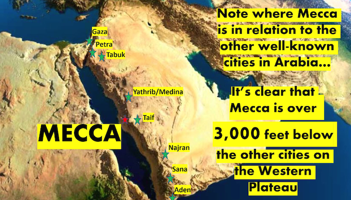 When we note the trade route through these towns (which were oases), we find that they are all located on the Western Plateau of the Arabian Peninsula, while Mecca is over 3,000 feet down below it in a desert, proving it was not on any trade route (see map above). [56]