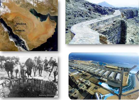 The reason for this is because Mecca was in the middle of a dessert and had no water. Trade needs people, and people need water, food and towns, all of which never existed in Mecca until the mid 8th century, over 100 years after Islam was supposedly created. Because of Mecca’s water problem, Queen Zubaydah’s Aqueduct was built in 801 A.D. (see upper left pic above), which then had to be refurbished 9 times in the subsequent 974 years due to the overbearing need for drinkable water; and then finally it was replaced with desalination plants after 1926 A.D. [57]