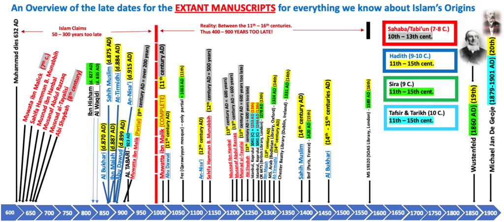 But more recent research shows that these Islamic documents are not nearly as old as Muslim scholars believe. Look at the timeline above for extant (existing) Manuscripts for everything we know about Islam’s origins. [22] From left to right, Islam claims that the Sahaba and the Tabi’un, the first and second generation of eyewitnesses to Mohammed and the Qur’an, were written in the late 7th to early 8th centuries, and yet there is no 7th – 8th century documents for these writings. They do not appear in writing until the 9th to 13th centuries: Muwatta ibn Malik:9th century (200 years later), Sahifa Hamman B. Munabbih: 12th century (500 years later), Musnad ibn Hanbal:13th century (600 years later), Musanaf Abdul Razzaq:13th century (600 years later), Musnad al-Tayalisi:13th century (600 years later), Abi Shaybah:13th century (600 years later) – this suggests they were all written by others over 200-600 years later and redacted or attributed back to the 7th – 8th centuries! Thus, they are most likely all fraudulent. [23]