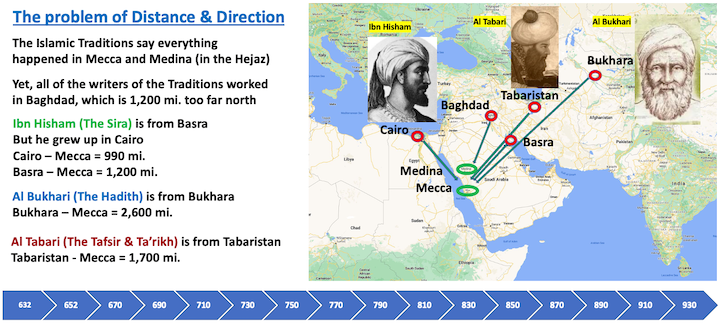 Ibn Hisham, who wrote Mohammed’s biography (the Sira), is from Basra, but he grew up in Cairo and wrote in Baghdad. Cairo is 990 miles from Mecca. And Basra is 1200 miles from Mecca as is Baghdad. Sahih Bukhari who wrote down the sayings of Mohammed (the Hadith), is from Bukhara which is 2,6000 miles from Mecca. Al Tabariwho wrote down the commentaries of the Qur’an and the histories of Mohammed (The Tafsir & Tarikh) is from Tabaristan (northern Iran today) which is 1,7000 miles from Mecca. None of these traditional writers lived or worked in Mecca or Medina. They were too far to the north from Mecca and came from east and west of Baghdad.