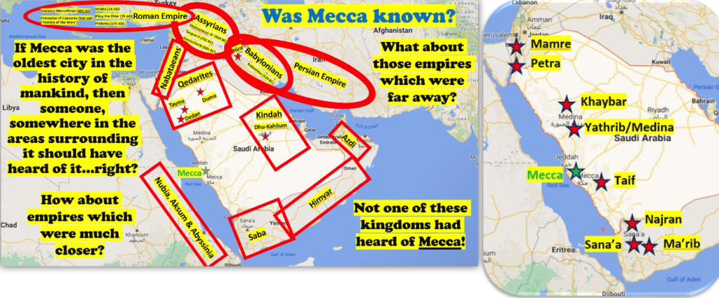 Dr. Crone visited several surrounding civilizations such as the Assyrian, Babylonian, Persian, Roman, Nabataeans, Qedarite, Himyarite, and Nubian civilizations, etc. (see red circle and rectangle areas on above map), and read their ancient documents and she could not find one reference to Mecca.[50] So, Crone visited the lesser-known towns closer to Mecca on the Arabian Western Plateau which were oases, and she found they were well-known and well documented all the way back to 300 B.C., yet she did not find one mention of Mecca (see above map). [51] Townsend agreed with Crone’s findings, stating that there is no primary source evidence of the existence of an ancient city in the present location of Mecca. [52] He observed that there are numerous mentions of Ta’if, just 70 miles away, as well as Najran, Sana’a, Medina, and Petra – but no mention of Mecca. There is even an absence of the name of Mecca in the ancient inscriptions found in the records of cities that occupied the Arabian Peninsula. [53] If Mecca was known as the “mother of the villages [cities]” as the Qur’an states (Qur’an 6:92; 42:7), then surely there would be documents from the 7th century, or earlier, that would mention the city as well as the people.