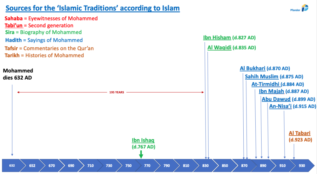 The fifth Muslim source is the Tarikh or the histories of Mohammed also pictured in light brown print in the above chart. Both the tafsir and tarikh contributions were first written down by Al Tabari who died in 923 A.D., [21] almost 300 years after Mohammed. Did Al Tabari know Mohammed or witness his words and actions? No, of course not.