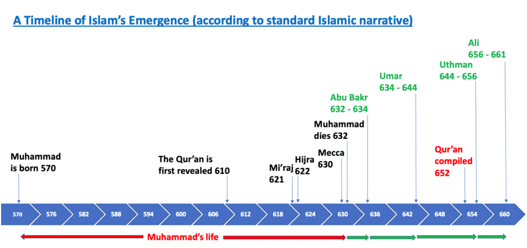 Let’s look at the timeline for Islam’s emergence according to the standard Islamic narrative (see above timeline). Mohammed was born in 570 A.D and started to receive his revelations in a place called Mecca in 610 A.D. In 621 A.D., the Mi’raj took place whereby Mohammed is suddenly awakened in the middle of the night and told to get on the back of a winged horse called a Buraq, which transported him from Mecca to Jerusalem where he ascended through the seven heavens and visited all the previous prophets (Jesus was found in the second heaven, Moses in the sixth, and Abraham in the seventh). [7] Finally, Mohammed was taken into the presence of Allah where he bargained Allah down in his command to pray fifty times to five times a day. [8]